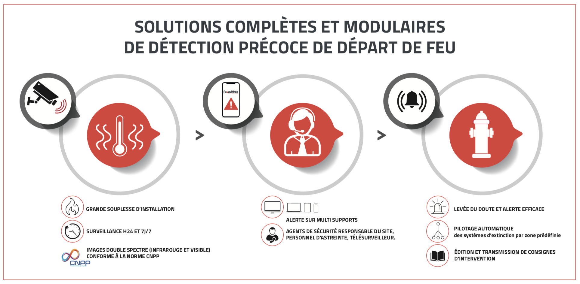 C’est l’élévation de température, énergie conduisant à la réaction en chaîne générant l’incendie, qui est repérée par les caméras thermiques de la solution. L’alarme est donnée instantanément.